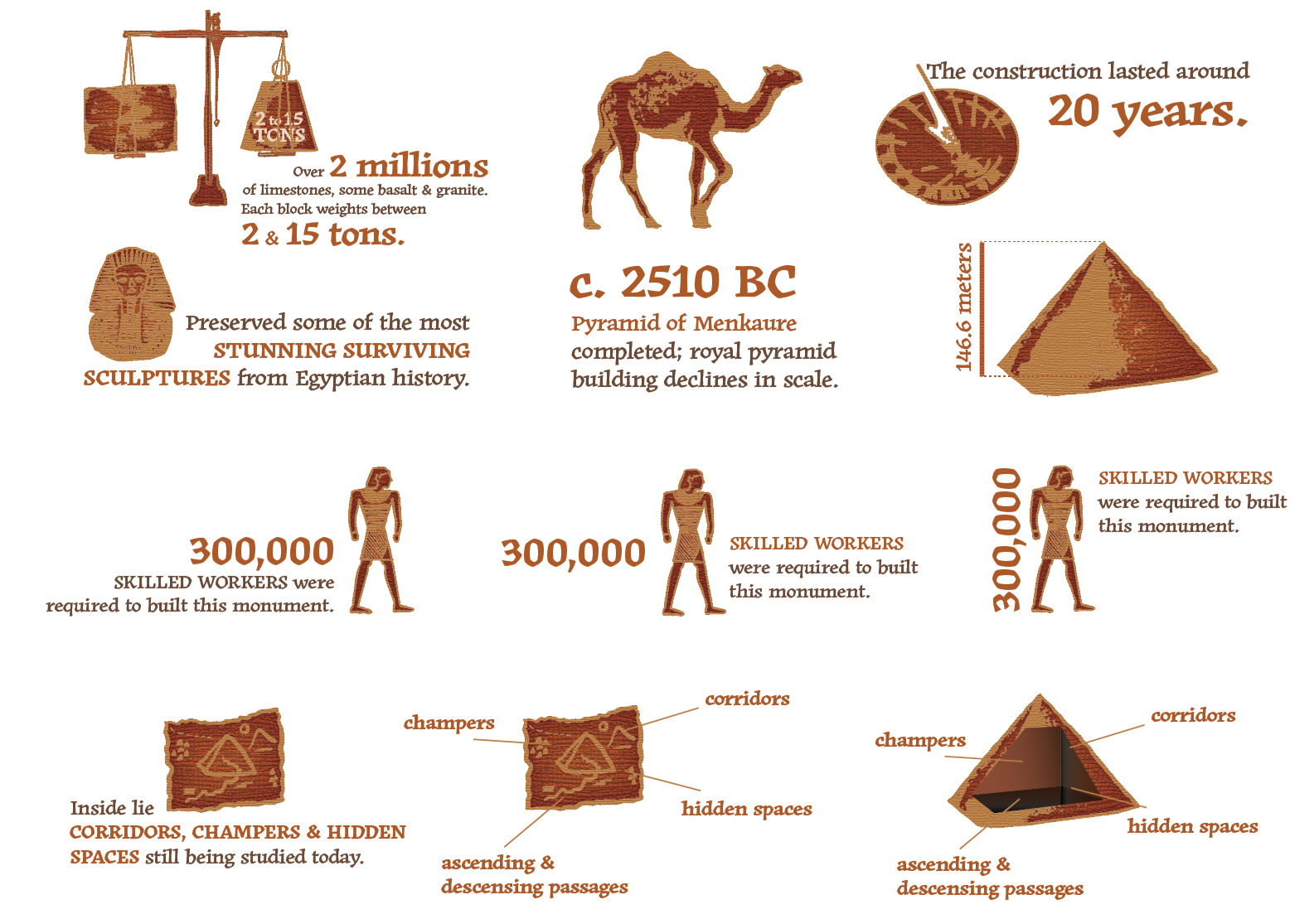 The poster's main graphic is the Great Pyramids of Giza, and its accompanying icon system maintains the same hand-drawn, hieroglyphic style.