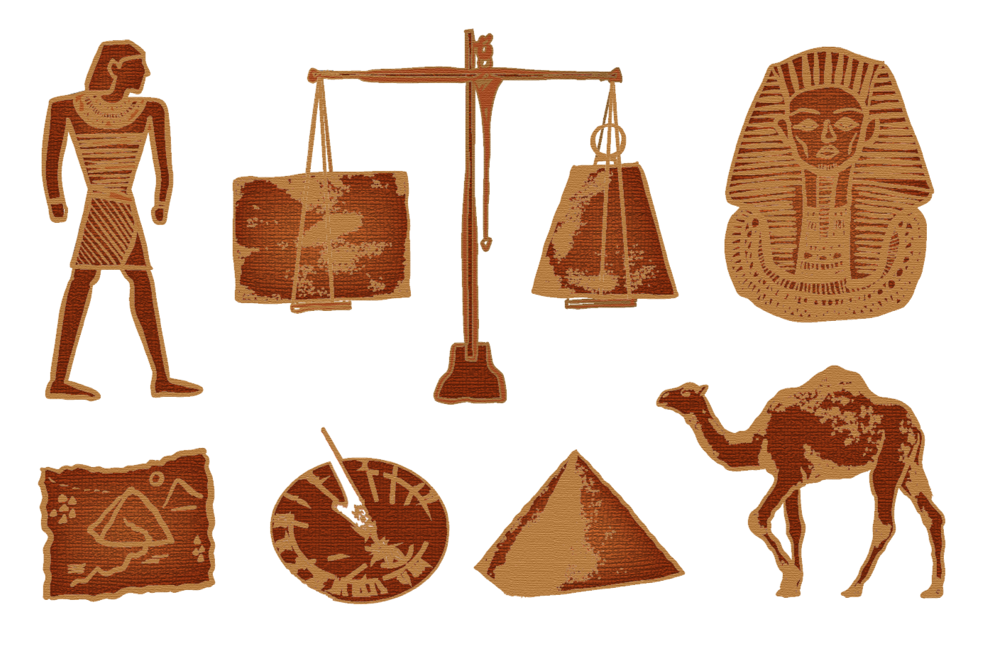 The initial research phase involved examining images of the pyramids, ancient Egyptian hieroglyphs, statues, and their distinct art style. This style subsequently informed the development of the initial sketches and icon system.